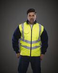 Conforms to ENISO20471:2013 Class 2, Immune from metal detector and scanner, ideal for electronic and telecommunication industries, Reversible with interactive zip, 300D PU coated polyester outer fabric and detachable sleeves, Smart diagonal chevron reflective tapes around the body for style and safety, Soft touch quilted navy micro fabric lining on the body and arms, Mobile phone pocket on the right hand chest with reflective-piping flap sealed with hook and loop, Elasticated cuffs, Two bottom pockets with with reflective-piping flaps, Inner hook and loop sealed pocket